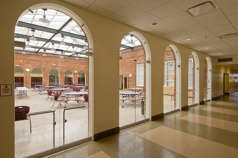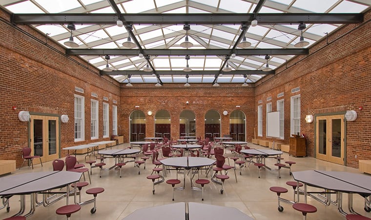 A new Center for Science and Technology was carefully woven into the building’s historic grain. The original “Nature Study Court” became a student union/café, providing students with dining options. The gymnasium became a library and media center.