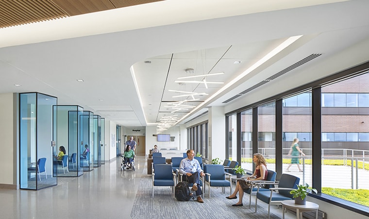 The campus’ clean, uplifting design also features abundant parking and provides room to expand on the 150-acre site. Fred and Christine Andreae’s philanthropy provided for a 2.5-mile hiking trail behind the hospital.
